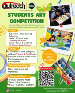 Outreach, in association with Unique Art and Craft, is organizing a Student Art Competition at Ekamra Hat on 14th February 2026. The objective of this event is to provide a creative platform for students to express their ideas and awareness through art based on the significance of World Radio Day.